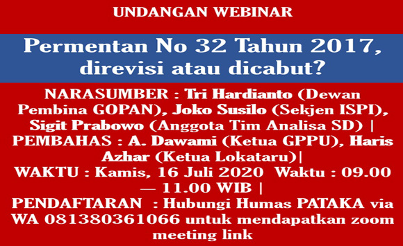 Webinar 2 PATAKA July 12, 2020 No Comment 152 Views “Permentan No. 32 Tahun 2017, direvisi atau dicabut?” Kamis, 16 Juli 2020Waktu: 09.00 – 11.00 WIB Info dan pendaftaran dapat menghubungi Humas PATAKA via WhatsApp 081380361066