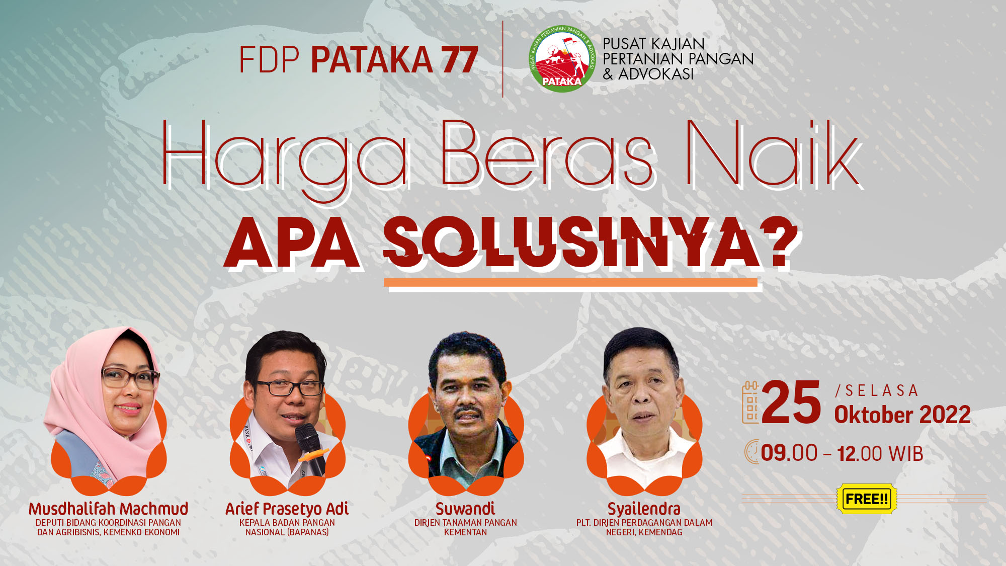 “Harga Beras Naik, Apa Solusinya?” Jakarta – Pusat Kajian Pertanian Pangan dan Advokasi (PATAKA). Sehubungan munculnya isu kenaikan harga beras dan gabah sejak bulan Agustus 2022 yang lalu. Beberapa faktor yang diyakini mempengaruhi kenaikan